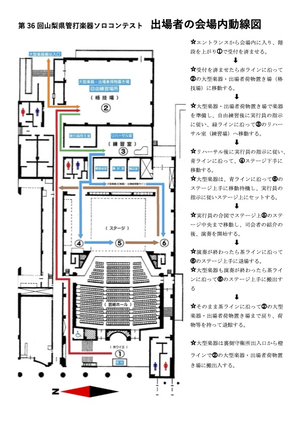 - 館内での移動は、出場者の会場内動線図に従って移動してください。但し、大型楽器のステージへの搬出入は、ステージ上手より搬入し再び上手へ搬出します。